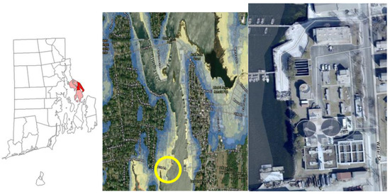 To that end, the authors undertook an effort to validate the damage curves by applying the method to Cranston, Warwick, and West Warwick WWTF located on Pawtuxet River, RI (Figure 7) that were subject to damage from a 500 yr flooding (compound, three separate rain events) that occurred over a several day period in March/April 2010 [12]. The inundation levels for the event have been documented by an analysis performed by the US Geological Survey (USGS) based on gauge station observations [13,14]. A detailed hindcast of the event has also been performed and validated with these observations [15]. The locations of the three facilities are well above the high tide line and were subject to rainfall and associated runoff induced flooding, but not storm surge.