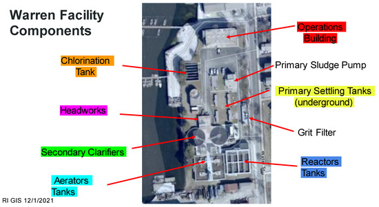 The Warren WWTF is located adjacent to the Warren River on the eastern side of Narragansett Bay, RI (Figure 2). The facility processes an average of 1.9 MGD (million gallons per day), with an estimated design flow of 5–6 MGD. The average elevation of the facility (and its components) is approximately 6 ft (NAVD88). The treatment plant has a current (2022) assessed value of $50 M and was recently (2019) upgraded ($20 M) to make the facility more resistant to climate change and sea level rise [8,9,10]. The major components of the facility are shown in Figure 3.