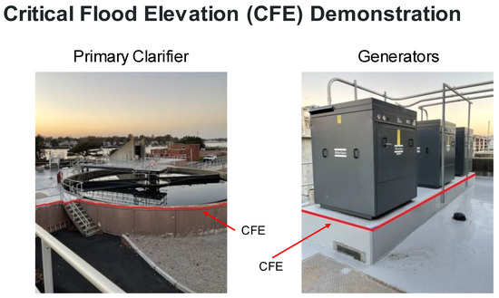 Example of vertical locations of Critical Flood Elevation (CFE) for primary clarifier and generators, Warren WWTF.