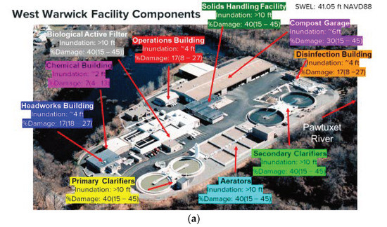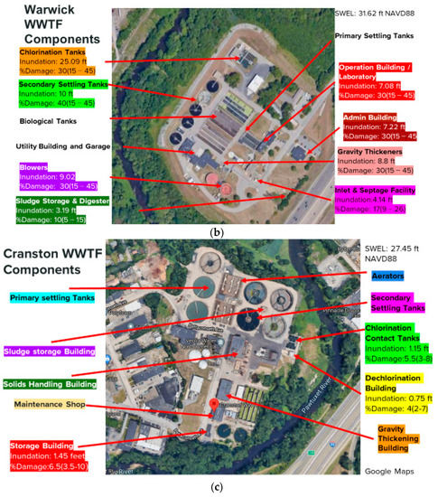 The damages to each component of the WWTF were estimated using the FEMA HAZUS damage curves. The elevations and CFEs for each component of the facilities were either provided by the plant operator or by measurement using Real Time Kinematic (RTK) mapping techniques [5]. Figure 9 shows an image of the components for each facility, West Warwick (a), Warwick (b), and Cranston (c). For each component, the level of inundation relative to the CFE is provided and the damage estimates showing the average, followed by below and above average damage (average (lower–upper)) are provided. Note that if the component was not impacted, no values for damage are provided. A review of the three figures clearly show that damage is predicted for most of the components of the West Warwick and Warwick facilities, with very limited damage for the Cranston facility. This is consistent with the flooding maps shown in Figure 8.