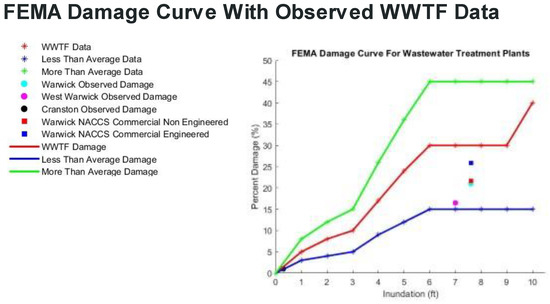 The analysis provided no insight into the size of the facility on damage. The Warwick and West Warwick facilities are comparable in their design capacity and experienced comparable damages. The Cranston facility has twice the design capacity of the other two, but very limited damage, because of very low inundation levels. It has been particularly frustrating not to be able to find the underlying technical literature that supports the damage curves as provided in the FEMA HAZUS user’s manual or to find published work that has attempted to validate the model [6,7,17].