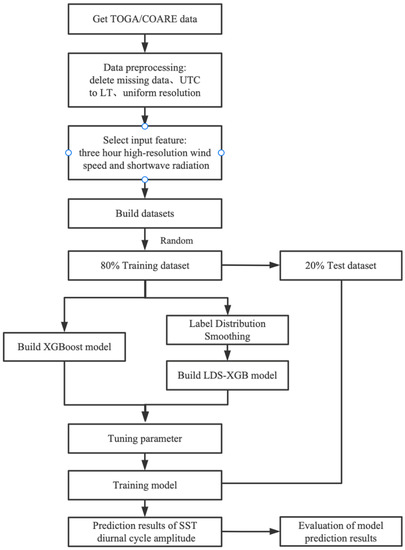 First, the observed data set, containing SST diurnal cycle amplitude, high-resolution wind velocity, and short-wave radiation values, was randomly divided into a training set and a testing set according to the ratio of 80%:20%. Second, based on the LDS-XGB algorithm, the model was trained using the training set to build a regression prediction model of the SST diurnal cycle amplitude. Finally, the model’s prediction ability was verified using the testing set. This study used the Python language environment to build the XGBoost model, mainly based on the scikit-learn library. According to the prediction algorithm flow, the pre-processed dataset was imported into the LDS-XGB model. After finding the optimal parameters, the model was trained, and the prediction results were obtained.