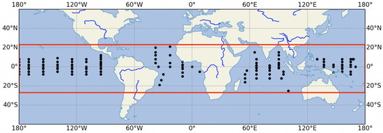 The observation data used are from the Tropical Ocean-Global Atmosphere Coupled Ocean-Atmosphere Response Experiment (TOGA/COARE) buoy array, including SST, wind velocity, shortwave radiation, longwave radiation, sensible heat flux, latent heat flux, etc. The data were collected from 133 stations in the range of 25° S–21° N. The temporal resolution of the data was 1 h or 10 min, and the SST diurnal cycle amplitude was obtained by calculating the difference between the maximum and minimum SST temperature every day. The data ranged from October 1992 to August 2021. The buoy distribution is shown in Figure 2.