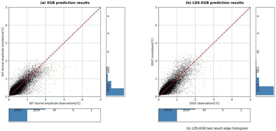 XGB prediction results: (a) LDS-XGB prediction results; (b) where the bottom histogram indicates the distribution of observed data, the right histogram indicates the distribution of predicted data, the horizontal coordinates in the scatter plot indicate the observation values, and the vertical coordinates indicate the simulation values.