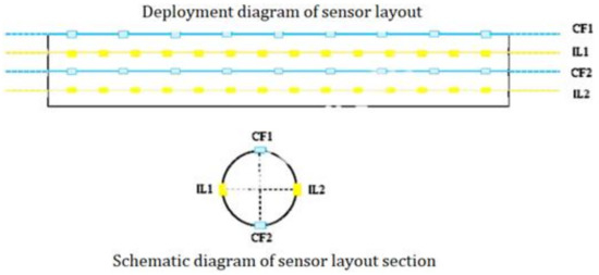 A total of 46 FBG strain sensors were arranged on the test riser model. They were arranged in the four directions of CF1, CF2, IL1 and IL2, in which 9 sensors were arranged in the two directions of CF, and 14 sensors were arranged in the two directions of IL. The arrangement is shown in Figure 4.