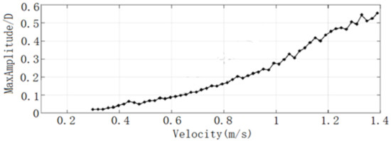 In the test, the riser rotated under the driving of the test device, and with its midpoint as the dividing point, reverse hydrodynamic pressure was generated on the riser. That is, it bore the action of the bidirectional shear flow. The IL vibration and CF vibration in the steady state reflected the vibration characteristics of the riser under bidirectional shear flow. In order to simplify the analysis, the IL vibration and the CF vibration can be studied separately. Based on bandpass filtering and modal analysis, the displacement of each measuring point of the riser can be calculated from its strain data. The calculation results show that the drag displacement and velocity distribution in the IL direction also exhibit the characteristics of antisymmetric distribution. It is 0 at the hinge points at both ends and near the midpoint and reaches the extreme value of drag displacement at about one quarter and three quarters. The test results of the different edge flow velocities show that the maximum drag displacement along the riser length increases with the increase in flow velocity and reaches 0.55 D, as shown in Figure 5.