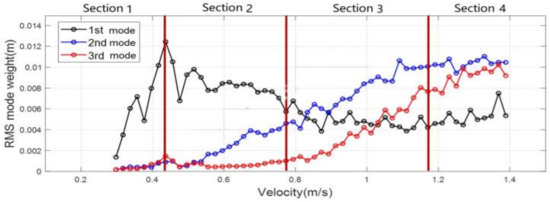 During the test, the vortex shedding behind the riser under bidirectional shear flow not only caused the riser structure to vibrate in the IL direction due to the drag force, but it also caused the riser structure to vibrate laterally due to the lift force. When the vortex-shedding frequency locks in the natural frequency of the riser, resonance will occur, and the vibration displacement amplitude of the riser will increase greatly. By changing the edge velocity of the riser model, the vortex-induced vibration characteristics of the riser and the phenomenon of frequency locking-in were studied. By processing the test data, the modal weights of the vortex-induced vibration in the CF direction under different edge flow velocities were obtained. As shown in Figure 8: Section 1 is first-order mode dominance; Section 2 is first-order dominance and second-order participation; Section 3 is second-order dominance and first-order and third-order participation; and Section 4 is second-order and third-order dominance and first-order participation. As the edge flow velocity increases from 0.4 m/s to 1.37 m/s, the vortex-induced vibration mode changes from first-order dominance, first-order dominance, second-order participation, second-order dominance, and first-order and third-order participation.