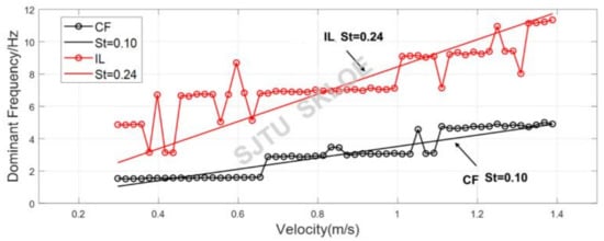 Figure 9 shows the dominant frequencies in the CF and IL directions of the riser models under different edge flow velocities. It can be found that the dominant frequency in the CF direction is always locked in the natural frequency under bidirectional shear flow, while the dominant frequency in the IL direction is locked in the natural frequency or twice the dominant frequency in the CF direction under different flow rates. Based on the dominant frequency obtained from the test, the St numbers in the CF direction and IL direction of the vortex-induced vibration under internal wave flow as obtained by linear fitting are 0.10 and 0.24. This provides a reference input parameter for the prediction of vortex-induced vibration under internal wave flow.