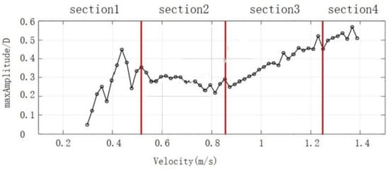 Figure 10 shows the change in the maximum RMS dimensionless displacement in the CF direction with the flow rate (the meanings of Sections 1–4 are the same as those in Figure 8). It can be found from Figure 10 that when the riser model presents the first-order dominance, the maximum RMS displacement in the CF direction increases with the increase in the flow rate. When the second-order modes begin to participate in the vortex-induced vibration, the maximum RMS displacement decreases slightly with the increase in flow velocity. When the third-order modes begin to participate in the vortex-induced vibration, the maximum RMS displacement of the riser model begins to increase with the increase in the flow velocity. Therefore, it can be considered that due to the characteristics of velocity distribution, when the dominant order of the vortex-induced vibration transits from odd order to even order, the response amplitude of the riser model under bidirectional shear flow will not increase with the increase in velocity.
