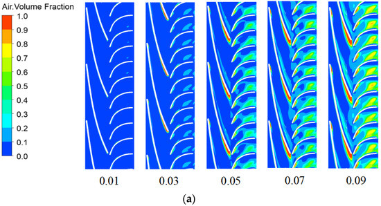 - The gas aggregation caused by the increase in IGVF plays an obvious role in promoting the coalescence of bubbles. When the IGVF is low, the gas-phase volume in the pump is less, the number of bubbles is less, and the bubble breakup trend caused by the pressurization unit is higher than the coalescence trend, and the bubbles tend to coalesce. As the IGVF rises, the degree of gas-phase aggregation in the pump increases, the number of bubbles increases, the probability of bubble aggregation caused in the pressurization unit increases, and the bubble size increases significantly.