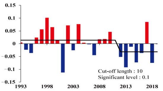 The KCI showed a positive anomaly (strong velocity) before 2010 and a rapidly decreasing current velocity pattern after 2010 (Figure 3). The STAR analysis results also showed that step change in the KCI was detected in 2010 (Figure 3). These fluctuations in the KCI were related to the longitudinal shift in the main axis of the Kuroshio Current (r = 0.55, p < 0.01). The analysis of the correlation coefficient between the longitudinal shift in the main axis of the Kuroshio Current and surface current velocity around the ECS revealed that the surface current velocity around the Ryukyu Islands, which are located in the main stream of the Kuroshio Current, has a positive relationship with the longitudinal shift in the main axis of the Kuroshio Current (Figure 4). In contrast, the western part of the Kuroshio Current mainstream had a negative relationship with the longitudinal shift in the main axis of the Kuroshio Current (Figure 4), implying that when the Kuroshio velocity was high, the main axis of the Kuroshio Current migrated eastward. However, when the Kuroshio velocity was low, it moved westward.