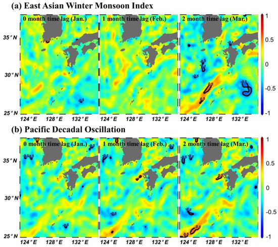 Horizontal distribution of the correlation coefficient between the geostrophic surface current velocity in January: (a) East Asian Winter Monsoon Index (January–March), and (b) Pacific Decadal Oscillation Index (January–March). Black lines represent significant levels: p < 0.01).