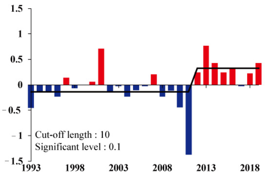 Long-term changes in East Korea Warm Current intensity in February. Black line represents step changes estimated using sequential t-test analysis of regime shifts analysis.