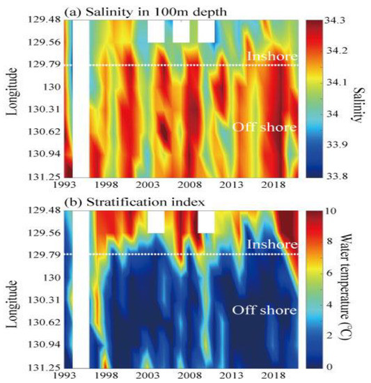 Long-term changes in salinity at a depth of 100 m in the WES near 37° E exhibited a distinct fluctuation pattern during weakened EKWC periods from the late 1990s to 2010; the salinity at the depth of 100 m around the inshore area ≤129.79° E was lower than 34.1 (Figure 7a). However, after 2010, the salinity at a depth of 100 m around the inshore area increased (Figure 7a), thereby indicating strong a EKWC (Figure 6). Furthermore, the stratification index was related to the intensity of the EKWC (Figure 7b). The stratification index increased after the late 1990s, which weakened EKWC. After the early 2010s, the stratification index was gradually reduced with a strong EKWC (Figure 7b). In summary, a low-saline water mass in the upper 100 m layer with strong stratification formed during the period of weakened EKWC. In contrast, during the strengthened EKWC period, highly saline water with weak stratification was observed (Figure 7). After 2019, the salinity and stratification index were slightly decreased (≤34.01) and increased (≥8), respectively; however, due to the absence of EKWC intensity data, the relationship between water column structure and EKWC intensity could not be analyzed in this study.