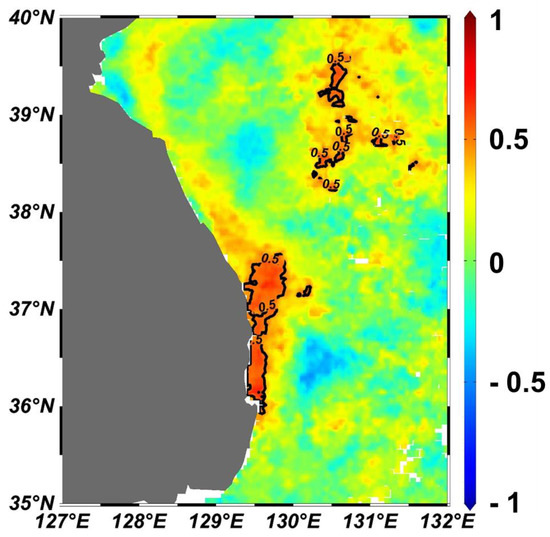 Horizontal correlation coefficient distribution between chlorophyll-a in February and stratification index in February. Black lines represent significant levels: p < 0.01).
