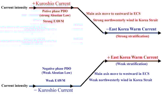Schematic of the relationship between intensity of Kuroshio Current and East Korea Warm Current. Abbreviations: ECS, East China Seas; EAWM, East Asian Winter Monsoon; PDO, Pacific Decadal Oscillation.