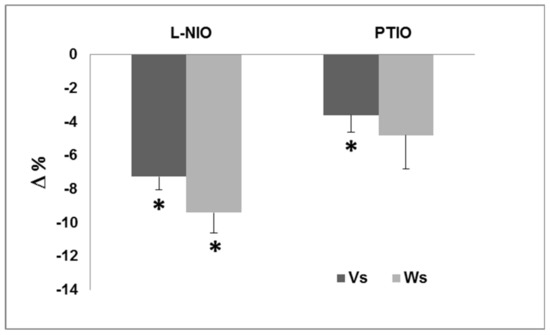 Effects of L-NIO (10−5 mol L−1) and PTIO (10−5 mol L−1) on stroke volume (Vs) and stroke work (Ws) in isolated and perfused heart of C. hamatus. Percentage changes were evaluated as means ± S.E.M. of five experiments for each group. Asterisks indicate values significantly different from the control value (Paired Student’s t-test, * p < 0.05).