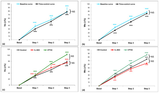 The hearts of C. hamatus isolated and perfused displayed a typical Frank–Starling response (Figure 2a,b baseline curves). Baseline and time-control curves were produced to isolate the time factor (i.e., the heart’s “memory”) of loading stimulation, proving the equality of the curves within the experimental error. (Figure 2a,b time-control curves). The pre-treatments with both, L-NIO and PTIO did not influence the Frank–Starling response in C. hamatus (Figure 2c,d).