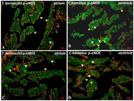 Phosphorylated eNOS immunolocalization in the atrium (A,B) and the ventricle (C,D) of T. bernacchii (A,C) and C. hamatus (B,D). phosphorylated eNOS is localized in the endocardial endothelium (yellow arrows) and the myocardiocytes (white arrows). Nuclei counterstaining: propidium iodide.