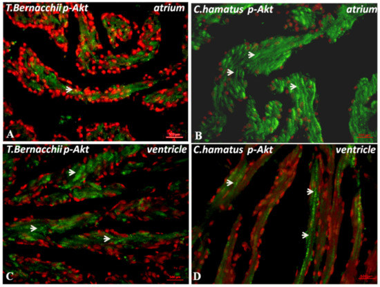 p-Akt immunolocalization in the atrium (A,B) and in the ventricle (C,D) of T. bernacchii (A,C) and C. hamatus (B,D). p-Akt is localized in the myocardiocytes (white arrows). Nuclei counterstaining: propidium iodide.