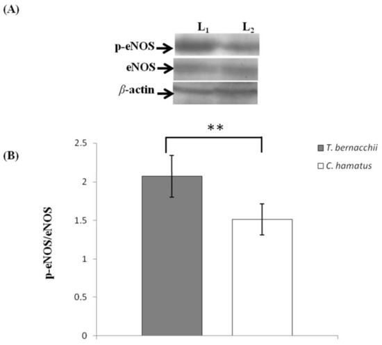 (A) Western blotting of eNOS and phosphorylated eNOS in ventricle extracts from T. bernacchii (L1) and C. hamatus (L2). (B) shows the densitometric quantification of the blots. The loaded protein amount was verified using an anti-β-actin antibody. Statistical differences were evaluated by the non-parametric Mann–Whitney U test (** p < 0.005).