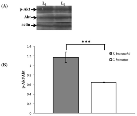 (A) Western blotting of Akt and p-Akt in ventricle extracts from T. bernacchii (L1) and C. hamatus (L2). (B) shows the densitometric quantification of the blots. The loaded protein amount was verified using an anti-β-actin antibody. Statistical differences were evaluated by the non-parametric Mann–Whitney U test (*** p < 0.0005).