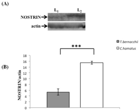 (A) Western blotting of NOSTRIN in ventricle extracts from T. bernacchii (L1) and C. hamatus (L2). (B) shows the densitometric quantification of the blots. The loaded protein amount was verified using the anti-β-actin antibody. Statistical differences were evaluated by one-way ANOVA followed by Bonferroni multiple comparisons test (*** p < 0.0005).