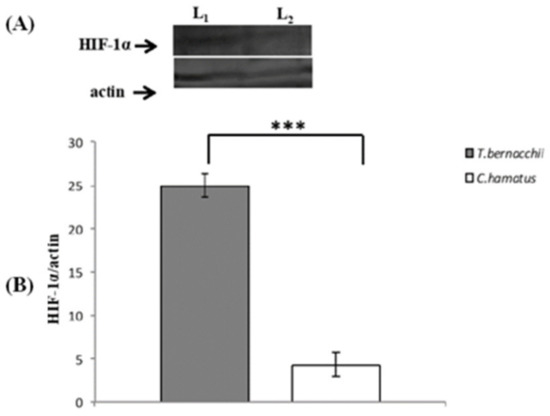 (A) Western blotting of HIF-1α in ventricle extracts from T. bernacchii (L1) and C. hamatus (L2). (B) shows the densitometric quantification of the blots. The loaded protein amount was verified using an anti-β-actin antibody. Statistical differences were evaluated by one-way ANOVA followed by Bonferroni multiple comparisons test (*** p < 0.0005).