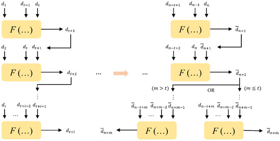 The time series of deformation data of each monitoring point obtained in situ is taken as the sample space. The prediction output value at time t + 1 is obtained from the monitoring value(1~t). The prediction output value at time t + 2 is obtained from the sequence’s monitoring value from time 2 to t + 1. By analogy, the prediction output value at time n + 1 is obtained from the monitoring value (n − 3~n). From this recursion, the extrapolation and evaluation of the deformation of the surrounding rock are finally completed. The predicted value at time n + 1 is composed of a sequence from n − 2~n + 1, and the value at time n + 2 is extrapolated.