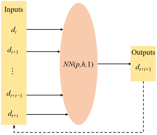 During application, a comprehensive evaluation index can better describe the state of the surrounding rock of the tunnel. Actually, it is challenging to collect many indicators and to deal with the resulting complex nonlinear relationship. Therefore, the effects of factors such as excavation-induced material behavior and the role of excavation sequence were ignored in the modeling. Referring to the previous literature (Xie, et al. (2006) [37]; Yao, et al. (2010) [38]), the input number t is set to 4, and the deformation amount of the number t + 1 is regarded as a single sample. Then, apply the 2nd to 6th data as input for the 7th data, and the recursion is finished similarly. When the deformation data are not enough to form a single sample, the prediction deformation value of the previous sample can be used as the input value to extrapolate the tunnel deformation time series.