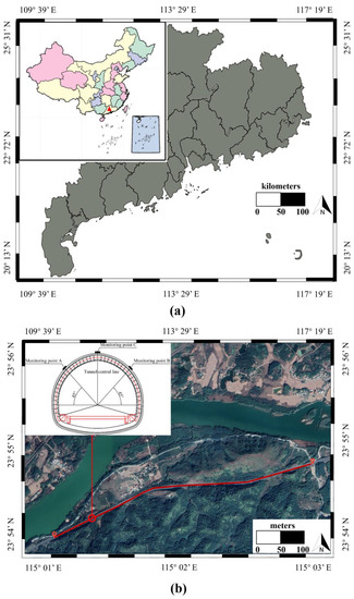 Site selection and representative monitoring section of a coastal tunnel in South China. (a) Project area; (b) a section of the tunnel.