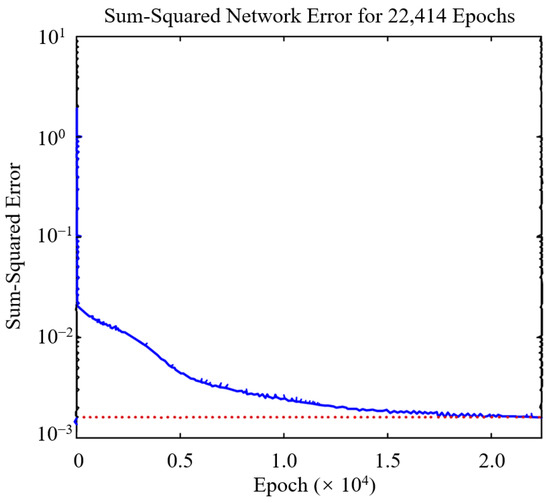 Re-inputting the 20 training samples and 4 monitoring samples into the optimized BPNN deformation prediction model for learning, and the adequate fitting of the network model is achieved through controlling approximation error and degree. The training error curve is shown in Figure 6, and the approximation curve is shown in Figure 7. Add the predicted value of the last time step to the original training sample. Similarly, re-input the 21 training samples and 4 monitoring samples into the model and predict the next step’s extrapolated deformation. Then, the extrapolated deformation value is added to the learning as a new sample, and the next extrapolated value is calculated.