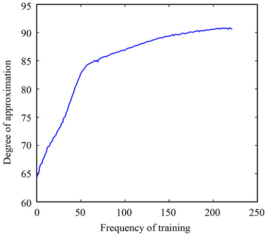 Obviously, a smaller approximation error will bring a larger approximation degree , resulting in better predictability. When the approximation error is close to 0, the approximation degree is close to 100. Since the prediction error of the monitoring samples is added, only when the prediction error is controlled within a small range, the approximation error will decrease with the reduction of the average relative error of the training samples. Therefore, the approximation degree increases first and then decreases with the increase in training times, which means that the prediction error of the monitoring sample decreases first and then increases. Additionally, the prediction ability of the network model declines (overfitting occurs). Therefore, the approximation could be used to control overfitting during training.