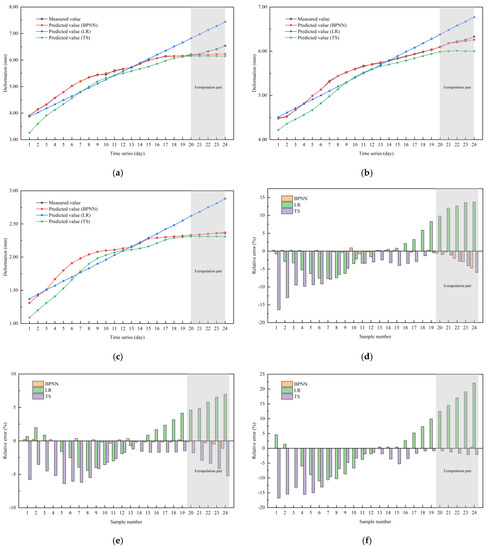 From Figure 8d–f, one can find that the linear regression model has a small error in the middle of the time series (maximum relative error 3.39%). Further, the TS model has smaller and smaller errors over time (the minimum error can reach 0.49%). On the whole, it is obvious that the errors from BPNN models generally are smaller than that of LR and TS. This can be explained by the intelligent adequate fitting prediction method, which uses the approximation error and degree to minimize the generalization and training error. While the LR may tend to fall into a local optimal solution, the TS models, however, require error adjustment through a large amount of historical data.