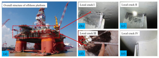 Cracks are prone to occurring when ocean platforms are subjected to complex environmental loads for long periods [1,2]. Crack propagation is defined as a dynamic process of crack growth under the action of external factors that reduces the stability of engineering structures and jeopardizes engineering safety [3,4]. Currently, the aging platforms that are in service have great potential security hazards due to fatigue cracks. As shown in Figure 1, one platform reported that cracks were found in the connection between the added horizontal truss. The crack propagation caused buckling deformation, which reduced the bearing capacity of the vertical column connected with the middle longitudinal bulkhead joint. The cracks in the four corners of the front and rear end walls of the living building had slowly expanded compared with several years prior. The above description indicates that crack monitoring is needed to provide safety warnings and damage diagnoses for ocean platforms.