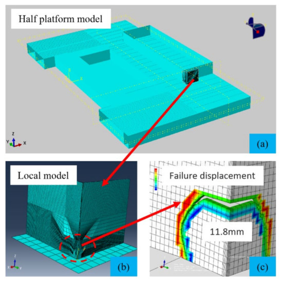As shown in Figure 2, finite element modeling of the living floor area was carried out according to the physical model of the platform. The model was simulated to various load conditions according to the environmental data, such as winds, waves and currents. The simulation results show that crack propagation is most obvious in the corner of the living building, which is consistent with the trend of the physical model. According to the data analysis, the whole crack process from germination to fracture demonstrates that it is essential for both the micro deformation of crack propagation and the large displacement of crack failure to be identified and monitored in real-time, as this can provide an early warning for ocean platforms when cracks are about to occur or abruptly enlarge, ensuring platform security [5,6].