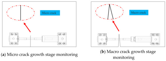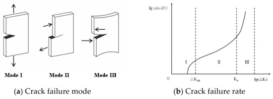 Cracks can be divided into three types: open type (type I), sliding type (type II) and tearing type (type III) [30,31], with regard to the form of the mechanical characteristics or the propagation direction. The propagation of a crack is divided into the initial stage, the propagation stage and the instability stage. The deformation is micro in the initial stage and the opening displacement is similar to the micro stage. The crack tip opening displacement caused by fatigue may be enlarged suddenly when the structure is subjected to an extreme external load or a long-term alternating load, which leads to large deformation and causes the strain variation to exceed the micro strain variation. In order to ensure the safety of offshore platforms, it is necessary to monitor the whole process of crack propagation. The crack propagation mode and failure rate are shown in Figure 3.