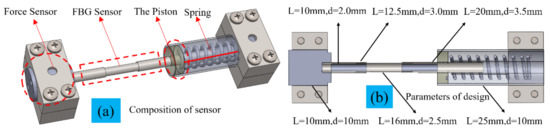 Each part of the adaptive range strain sensor is composed and carried out based on the design and sensing principle. The FBG sensor is encapsulated by a 2.5 mm diameter steel pipe in the middle of a grating and two 3.0 mm diameter steel pipes on two sides. The steel pipe with a diameter of 3.0 mm is connected to the force sensor as one of the fulcrum points. The 3.5 mm-diameter extension steel pipe is used to connect one end of the FBG sensor, which is fixed inside the epoxy resin as the second fulcrum. The spring installed outside the extension steel tube is adhered to using epoxy resin with a diameter of 9 mm and a length of 10 mm at the right end. The FBG sensor and the spring are attached using epoxy resin (with a through-line hole in the middle), with a diameter of 9 mm and a length of 5 mm as the piston. The piston is embedded inside the 10 mm steel pipe through static friction force. The piston will pop out when the force reaches for the FBG sensor. The spring is at the initial length when the piston does not move. The spring starts to work when the piston is ejected from the steel pipe. One side of the FBG sensor is fixed to the support while the other side is cemented to the piston. The piston passes through the optical fiber through the round hole. The force sensor and the 10 mm diameter steel pipe are fixed to the base and the cover plate, respectively. The parameters of the sensor structure are shown in Table 1.