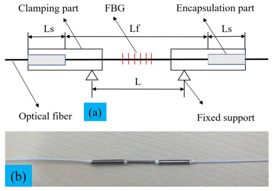 Enhanced sensitivity package: (a) Packaging principle of detailed design, (b) Physical diagram of FBG sensor.
