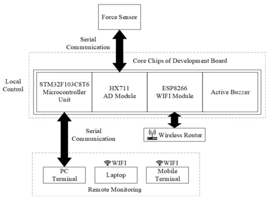 Embedded technology has been applied in the damage monitoring of cracks and component joints [34,35]. An SCM system [36,37,38] as a microcontroller can achieve data transmission and control functions by working with different modules. Regarding the overall design, the structural deformation is measured using the FBG sensor in the small-range mode. Large displacement is determined from the tension data by the force sensor, which connects with the STM32 SCM system. The microprogrammed control unit (MCU) controls the buzzer, which warns when the tension reaches the set threshold. The tension data are transmitted to the computer via an ESP8266 WiFi module, which connects with MATLAB to establish the TCP communication protocol.