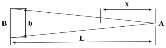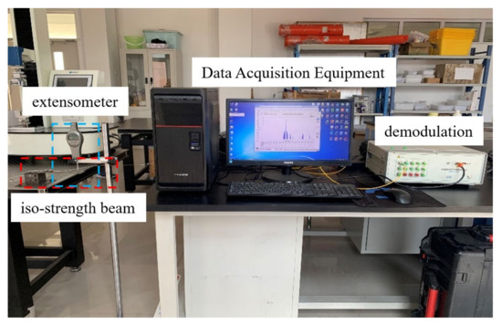 The wavelength offset and strain change of the packaged FBG sensor needs to be calibrated and tested on the optical platform for the purpose of subsequent model testing. As shown in Figure 10, the calibration device includes the FBG sensor, the demodulation device, data acquisition equipment and an extensometer. The length L of the iso-strength beam is 188 mm, the thickness Y is 2 mm, the left side is completely fixed to form the cantilever beam and the displacement load is applied to the right side. As shown in Figure 11, load F is applied to the right end point A of the iso-strength beam. The deflection generated at free end A is . The force corresponding to A-end is . The bending moment at distance from A-end is . Modulus of bending section , among them . Stress , where is the distance between the center of the sensor and the neutral axis and is the deflection measured by the extensometer. Strain . Therefore, the strain of packaged FBG can be obtained by the deflection.
