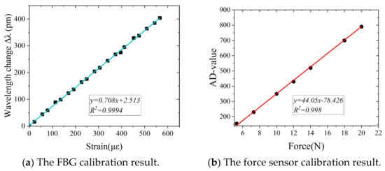 The FBG sensor calibration result is recorded in Figure 12a. The green line and its equation in the figure are obtained by line fitting. The slope is the sensitivity coefficient. Table 2 summarizes the coefficient and sensitivity errors of the three calibration tests of FBG sensor. It can be seen that the linearity of the three repeated calibration tests for the same FBG sensor are all above 0.999, and the relative errors of sensitivity are all below 2.5%, which shows good linearity and repeatability within the designed range. The variation of strain can be obtained by a wavelength shift of the FBG sensor through the calibration tests. Similarly, a digital display instrument is used to calibrate the force sensor, which determines the numerical relationship between the real force and the force processed by the AD conversion module. The stable value of the sensor is read repeatedly when it is under axial tension, and the average value is then taken. Subsequently, the real AD value is acquired when subtracting the AD value under tension from the initial value. The processed value is regarded as zero when it is negative. The processed value is divided by GapValue (a constant value determined by the calibration of the tension meter) to establish the real tension value when it is positive. It can be seen that the line linearity of the three repeated calibration tests for the same force sensor is always above 0.998, which proves that the linearity rate is accurate enough to read the force values. The force sensor calibration result is shown in Figure 12b. Table 3 summarizes the coefficient and sensitivity errors of the three calibration tests of force sensor.