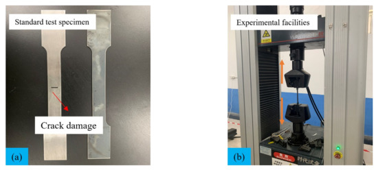 An experiment was designed to analyze the trend of crack propagation of the standard plate (Figure 13) in order to provide reference value for sensor monitoring, including two conditions of an 8 mm central crack and a 10 mm central crack. The experiment was carried out by universal tester. The parameters of the Q235 standard plate are shown in Table 4.