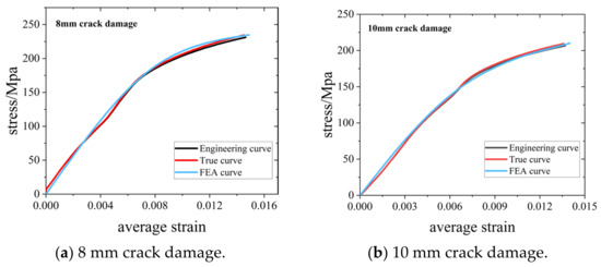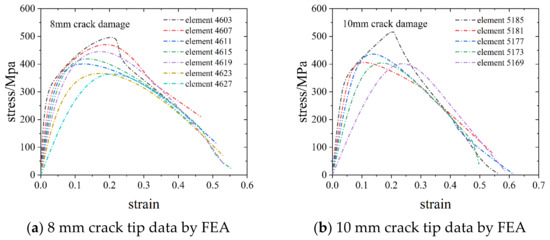 As can be seen from the data in Table 5, the stress intensity and the variation range of strain of the components with crack damage are greatly reduced, and the strength decreases further with the increase in crack damage. The true limit stress difference between the undamaged standard plate and the plate with an 8 mm crack and the plate with a 10 mm crack is 273.97 MPa and 303.44 MPa, respectively, and the true limit strain is 0.215 and 0.216, respectively. The FEA curve data are consistent with the experimental curve data. The stress errors of the 8 mm crack and the 10 mm crack are 0.53% and 1.81%, respectively. Furthermore, the stress–strain curve of the crack tip is analyzed using the finite element model below, providing a reliable analysis index for monitoring the crack tip fracture. The FEA data show the stress–strain curve of the crack tip element (Figure 16). The value is higher than the measured average stress–strain due to stress concentration at the crack tip. The standard plate with the 8 mm crack first fails at element 4627 nearest to the crack tip, which is the beginning of fracture failure in the model. Similarly, the fracture starts at element 5169 of the model for the plate with the 10 mm crack. The ultimate stress at the crack tip is approximately 491.81 MPa and 516.69 MPa, respectively.