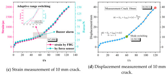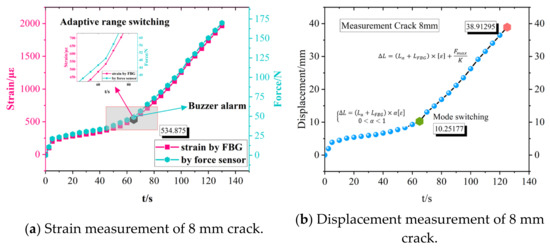 The sensor measurement results are shown in Figure 18. The (a) and (b) curves, respectively, reveal the strain measurement results of the 8 mm crack and the 10 mm crack. showing that the two sensors have high consistency and that adaptive range switching occurs at the inflection point of the curve. The sensor detected a small strain of 534.88 με and 547.90 με at the inflection point, respectively, and a large deformation of 38.9 mm and 39.3 mm, respectively. The beginning of a crack fracture was 10.25 mm and 10.50 mm in the monitoring experiment of standard specimens with crack damage. The error is small compared with the FEA data. The results demonstrate that the sensor has high precision in elastic measurement and an adaptive ability to monitor a large-scale displacement of the structure.