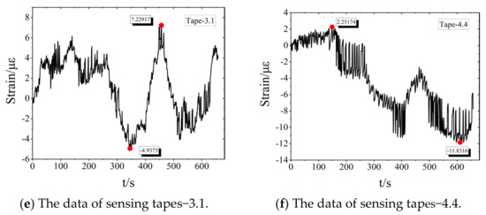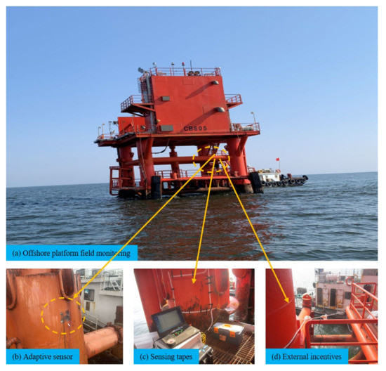 It is of great significance to continuously monitor and protect the damaged areas of aging offshore platforms, as the number of aging offshore platforms is increasing year by year in the Chinese Bohai Sea. For the stress detection of aging offshore platforms, the current specification does not clearly explain the specific implementation method, so we preliminarily applied adaptive sensors and used sensing tape for auxiliary measurement. Here, the developed sensor is applied to the aging jacket platform for field strain monitoring, which could provide potential value for the residual life assessment of the stress detection of the aging platform. The CB805 jacket platform is shown in Figure 19. The high-stress area is selected for sensor placement through field observation and previous finite element analysis. The adaptive range strain sensor was placed in the high stress critical area, and the distributed sensing tapes were arranged around it to obtain the strain field parameters around the crack damage, so as to realize the quasi-distributed measurement of the local crack damage area of the jacket platform. External excitation is applied by binding rope at the pile leg, which is dragged by the ship. The stress information of the pile leg and pipe joint is fed back by the strain response measured by the adaptive strain sensor and the surrounding distributed sensing tapes. The field monitoring data are shown in Table 8. Based on the field measurement results, it can be seen that the maximum fluctuation of the extreme value of the adaptive strain crack sensor in the high stress zone is 57.9με, and the maximum tensile strain and compressive strain are 13.3με and 44.6με, respectively. Similarly, the maximum fluctuation of the extreme value of the FBG strain sensor in the high stress zone is 54.1με, and the maximum tensile strain and compressive strain are 11.8με and 42.3με, respectively. The primary comparison results verify that the adaptive sensor can ensure the accuracy of micro-crack monitoring. The analysis results show that the adaptive strain sensor maintains the micro strain monitoring state of high strain sensitivity, and no cracking signal of structural fracture is detected. No large deformation can be seen by the naked eye from the field observation of the structure as well due to the high stiffness of offshore platform. In addition, the maximum fluctuation measured by the distributed sensing tapes along the horizontal direction is 33.8με, while the maximum tensile strain and the maximum compressive strain are 11.5με and 27.0με, respectively. The sensing tapes show the state of the strain field in the area around the stress monitoring, which is of great reference significance for subsequent stress assessment if required by relevant codes. The data of field monitoring are shown in Figure 20.