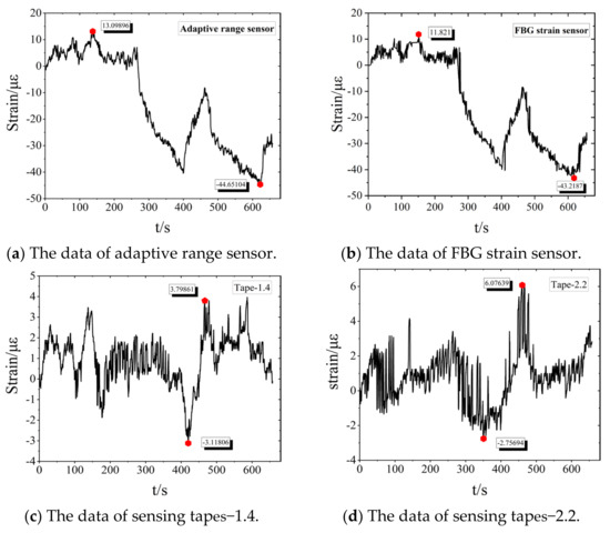 The α in Equation (3) is the adaptive coefficient, which should not be more than the allowable strain of the fiber when it is designed, so as to ensure the accuracy of the monitored strain. The sensor switches adaptively to large-range mode when the strain of FBG reaches the value. can be specifically customized according to the characteristics of the strain monitoring materials. The conservative value of FBG for strain monitoring is 2000/1.2 = 1666.7 με = [ε]. The yield strength of ocean platform steel is 355–460 MPa, which means that 1690 με is identified as having failure risk. The micro deformation stage of the structure in the linear range should be selected for the stress assessment. The packaged method of enhanced sensitivity in this study can amplify the strain measurement range three times. Thus can be customized to 33% for in this study, which is 550 με.