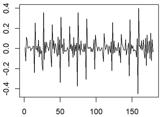 It is obviously seen that the time series exhibits a linear trend and heterogeneity in the variance structure from Figure 2. In order to eliminate these effects, we took a new time series by differentiating the log data. The transformed time series is displayed in Figure 3.