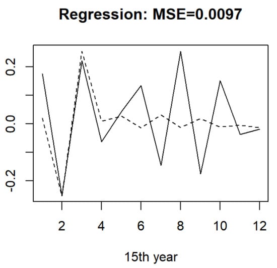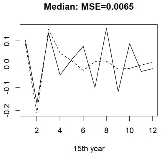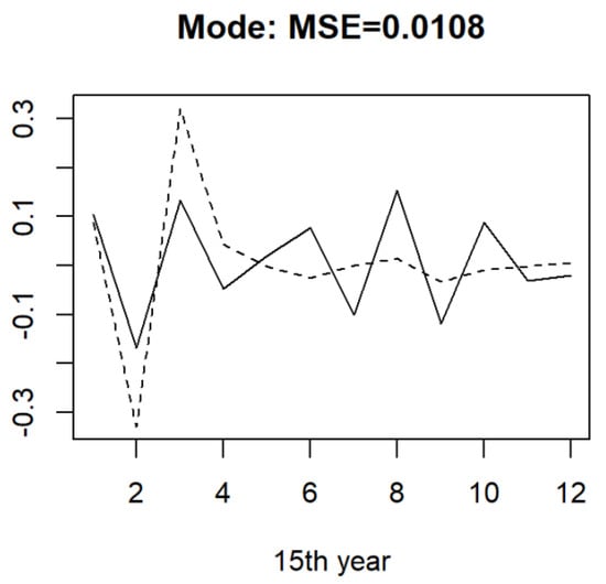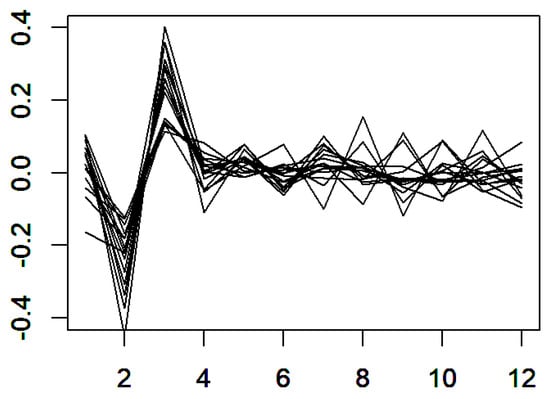 This section focuses on an application to economic time series coming from the container throughput of Shanghai Port described in Figure 2. We downloaded the monthly container throughput covering a period from January 2007 to December 2021 (180 months) from the official web page (https://www.portshanghai.com.cn/tjsj/index.jhtml) (accessed on 15 January 2022) of Shanghai International Port Group. The differentiated log data were recorded as a sequence of real numbers, which are composed of real data. To better use the functional methodology, we cut the original time series into a set of functional data. Hence, we chose . The data were put into a new matrix file of size , which is organized in Table 2. For the purpose of prediction, we used the means of the data corresponding to the 14 previous data to predict the 15th year.
