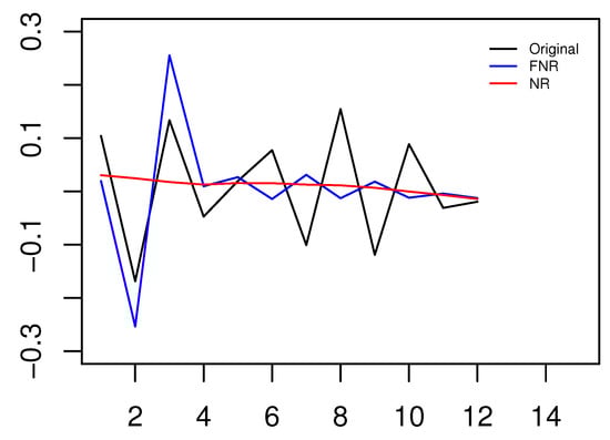 Figure 6 describes the curves of the FNR and NR models. Table 4 compares their performance in terms of the MSE, MAE, and MAPE. From Figure 6 and Table 4, we can draw the conclusion that the FNR model had smaller errors than the NR model, which implies that functional data produce more accurate predictions. The reason may be that the classical nonparametric regression model treats the original time series as single points regardless of the continuity of the dataset.